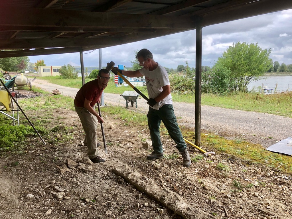Démolition à la masse et à la barre à mine des maçonneries sous l'abri. Dépôt à la brouette des gravats à côté de la cale pour remblayer le trou à marée basse. Arrachage des arbustes et des broussailles. Passage de la débroussailleuse sur tout le terrain. Ramassage des plastiques amenés par la Seine .Lavage du hangar, des vestiaires et des toilettes. Découpage d'un vieux bateau. Mise à la déchetterie des déchets et construction d'un chariot. Le club est tout propre et rangé pour la rentrée.Merci et bravo à toute l'équipe!