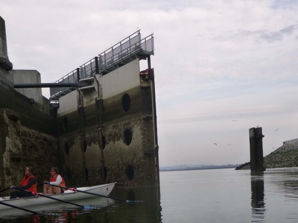 Il est temps de se présenter devant l'écluse. Les Caudebecquais en ont déjà passé beaucoup des écluses mais celle de Honfleur est impressionnante ,énorme marnage! Martine est toute petite là haut sur le quai. A 9H45, les lourdes portes souvrent sur l'estuaire de la Seine. Le temps et l'eau sont d'abord calmes et le courant nous pousse tranquillement vers le pont de Normandie. Puis vers l'estuaire de la Risle la Seine gronde, elle bouillonne autour de nos frêles embarquations. D'énormes forces sont en action, le courant très fort de la marée d'équinoxe déblacent des millions de mètre cubes d'eau et de sédiments. L'extraordinaire courant heurte les massives bouées du chenal.C'est très impressionnant, il faut rester concentré pour ne pas se mettre en danger au milieu des éléménts déchaînés. Nous voguons à vive allure sous le pont de Tancarville, nos bateaux font des pointes à 20 km/h! La zone est très dangereuse. Sous l'eau boueuse se chache des pièges, des bancs de roches et de vases provoquent des bouillons et des puissants courants. Des pieux en fer pourraient évantrer les yolettes. La grande lessiveuse nous pousse vers Quillebeuf-sur-Seine la cité historique des pilotes de Seine. Après le bac le courant est encore puissant mais la Seine se calme enfin. Nous retrouvons le plan d'eau de nos habituelles sorties. François et Martine nous attendent sur la cale de Vieux-Port pour une petite pause. Tout c'est bien déroulé, c'est une exprérience forte de ramer dans un petit bateau au milieu de l'estuaire. Nous sommes dans les temps mais nous ne traînons pas pour profiter de la puissance de la marée montante. Les rameurs ont encore 14 km d'effort pour atteindre Caudebec-en-Caux. A 13h45 les équipages accostent sur la cale du club. Tout monde est heureux d'avoir vécu cette belle exprérience que seul l'aviron et le club de Caudebec permettent de vivre. Honfleur/ Caudebec, pour reprendre une expression de François "c'est galette"!