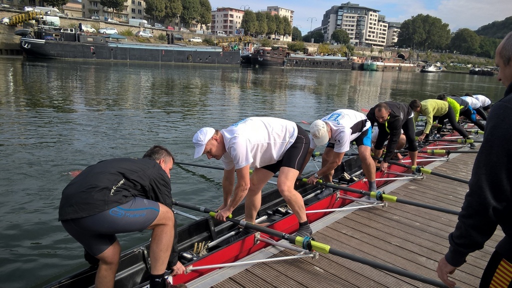 Chez nous impossible d'avoir un 8 , avec une longueur de 18m , le bateau ne rentre pas dans le hangar et ne pourrai pas être mis à l'eau sur notre cale. Heureusement la ligue de Normandie nous a prêté un 8 de couple. Mais ça change des yolettes , alors il faut de la discipline et travailler la cohésion. Nous avons peu de temps pour nous caler , juste quelques kilomètres entre le club et la presquîle du Rollet avant le début des course et un petit échauffement avant l'épreuve. Pour une première en huit ça progresse vite et nous voilà prêts à en découdre. Nous ramons dans la catégorie loisir contre Belbeuf et des Anglaises en huit de pointe. 10 bateaux loisirs concourent en 8 de couple et 3 en 8 de pointe.