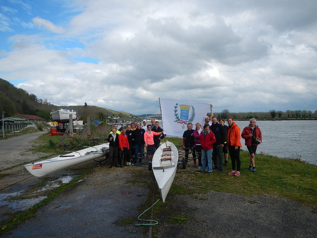 Cadeau des grandes marées une tête d'arbre énorme est échouée sur la cale. Impossible de mettre un bateau à l'eau. Le pilote vient à notre secours. Nicolas fait le lamaneur sous l'averse en solo pour amener une corde à la pilotine. L'opération est un succès, la cale est libre. Nos 8 amis belges regardent la manoeuvre et doivent se demander où ils sont tombés. Ils viennent du club des "3Y" à Seneffe, près de Charleroi. Ils sont venus les bras chargés de spécialités, gâteaux, bières et chocolats. Eric est le maître du barbecue, à l'abri sous l'avant toit à cause de la pluie, ça boucanne dans le club! Les Caudebecquais ont apporté de quoi se régaler et se désaltérer avant la sortie en Seine.L'adjoint au sport Christian Capron vient saluer nos invités. Un p'tit coup de calva et il est temps de se mettre à l'eau le ventre un peu lourd. Les éclaircies arrivent et les 4 yolettes et le doubles mixtes partent pour faire découvrir la Seine aux 8 rameurs belges. La météo s'améliore et les bateaux arrivent contre le courant à la cale du Trait. Même si le vent est contre au retour les équipages arrivent facilement au club. Les belges sont contents de leur balade et un peu surpris par notre mise à l'eau avec notre cale et nos chariots. Photos de groupe pour immortaliser l'événement avant de boire un coup et finir les gâteaux . Bel échange avec nos invités qui sont très sympa , il faudra aller leur rendre visite pour les revoir et découvrir leur région. Peut-être fin juillet pour une rando avec ascenseur à bateaux. Nos compères partent pour leur hôtel à Rouen . Ils vont faire du tourisme et ramer demain au CNAR. Très joli moment passé ensemble vive les "3y" et vive l'ACVS!
