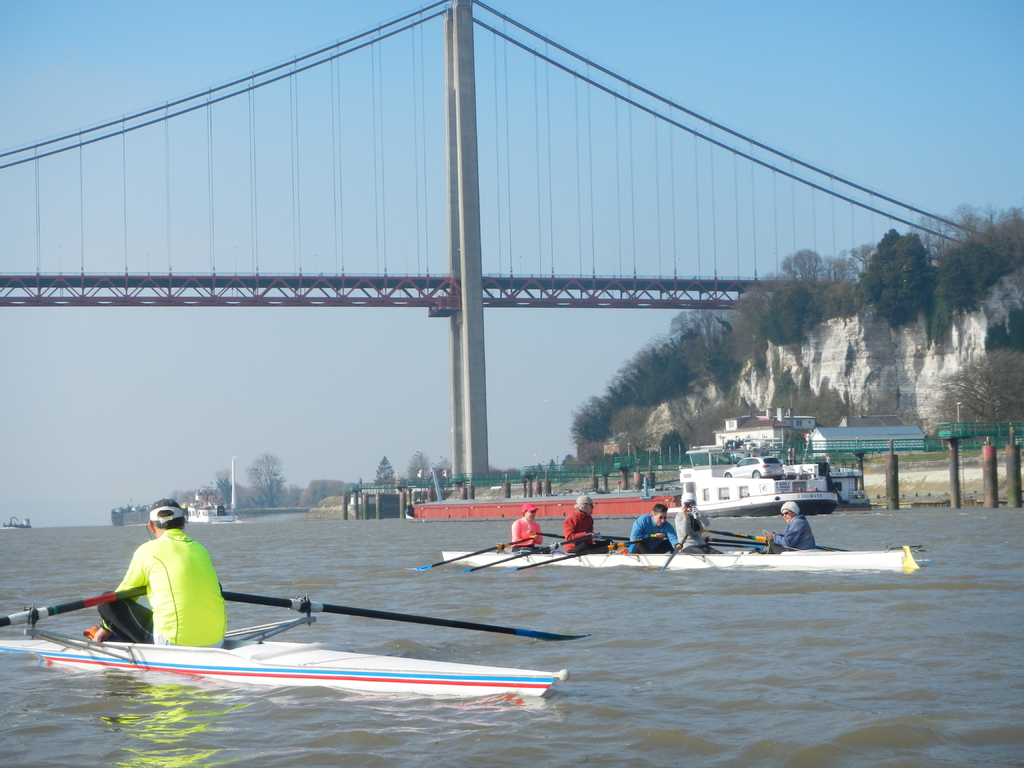 Les conditions de navigation sont parfaites, le courant est très fort, pas de vent et grand soleil. Les équipes arrivent les doigts dans le nez sur une plage avant Quillebeuf pour une petite pause. Tout le monde rigole , jusque là le programme optimiste de Nicolas est tenu. Vu que tout va bien direction de Pont de Tancarville dans la joie et la bonne humeur.Une petite bouffée de chimie vers Port Jérôme et regroupement des bateaux au pont de Tancarville. Pause photo pour immortaliser l'exploit et voilà la marée qui monte comme prévue à 11h20 . Un petit vent de Nord Est se lève et le clapot se forme mais grâce au courant très fort les premiers kilomètres passent vite. Nicolas et la yolette des "plus jeunes" avancent bien malgré le vent contre . Dans la 2ème yolette, les rameurs dénoncent la publicité mensongère de Nicolas qui avait promis un retour rapide à 20km/h! Mais le vent contre annule l'effet du courant . Catherine qui rame que les jours de pluie et de vent garde le moral. Lucile ne sera pas rentrée à 13h00 pour le repas du dimanche . L'endurante Géraldine se prend une vague et reviendra frigorifiée. Yves qui manque d'entraînement n'en peut plus. Henri heureusement est en forme et tire son équipage .