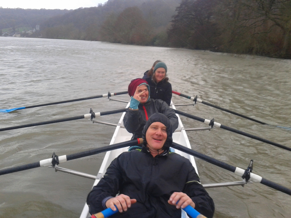 Météo de saison en ce moment sur la Seine. Mais le mauvais temps ne doit pas nous arrêter de ramer . En plus les mauvaises conditions provoquent souvent des sorties sympa avec de la rigolade . Et quand on rentre au club bien fatigué, le cul mouillé, on a la banane. Pendant que François entretenait les bateaux, Sylvie, Béa, Fred, Claire et Nicolas ont affrontés les éléments. Renverse + gros coup de vent + pluie = super sortie. Nicolas à la barre casse les oreilles des rameurs qui écrasent leur planche à pied pour lutter contre les éléments. L'équipage tient le coup et la yolette avance lentement et surement sous les grains. Après Villequier demi-tour et là c'est du beurre. Le vent, le courant et les bouillons des rameurs propulsent le bateau. La berge défile et voilà déjà le club. Virage contôlé pour accoster , François nous chope avant que le courant nous éloigne, pieds dans l'eau, chariot , on ne traîne pas . Un café chaud nous attend. On a bien fait de venir.