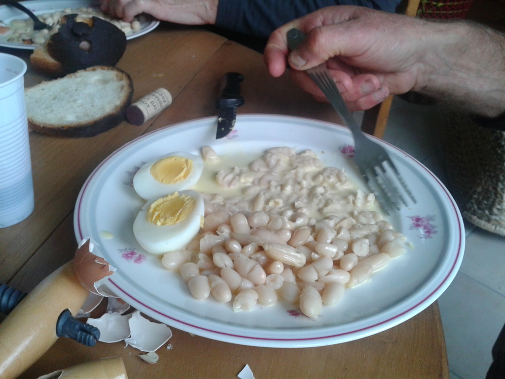 Caro nous a préparé un bon repas chaud. Tarte aux chèvres et pignons de pin, fayots à la crème bio et oeufs durs du jardin avec de belles tartines d'un gros pain. On se régale! Un peu d'histoire locale, les habitants d'Heurteauville étaient appelés les maqueux de fayots car ils cultivaient beaucoup de haricots blanc. Nous découvrons les habitudes culinaires de Jean-Marie qui se nourri exclusivement de pain et de jambon.Les ripailles continues, très beau plateau de fromage et la ronde des desserts. Tarte aux pommes hors catégorie de Catherine,délicieux moelleux aux châtaignes de Julien, riz aux lait à tomber par terre de la mère de Caro. Il reste encore 2 gâteaux mais on cale.